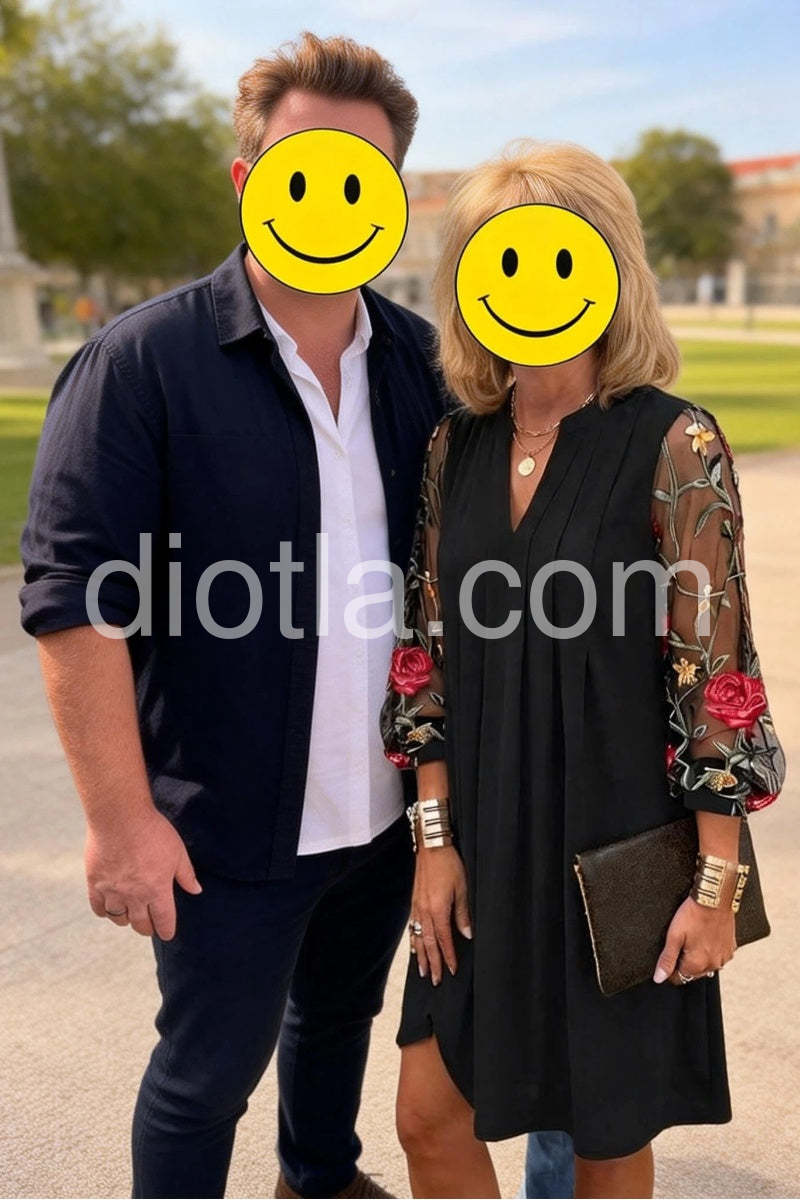 Yes!It runs true to the garment size chart please choose your size based on your measurements.Introducing our newest addition: Elegant V-Neck Sheer Sleeve Mini Dress. This dress features a flattering V-neckline and sheer sleeves for a touch of elegance. Made with high-quality materials and expert craftsmanship, this dress is perfect for any special occasion. Look and feel sophisticated with this must-have dress.